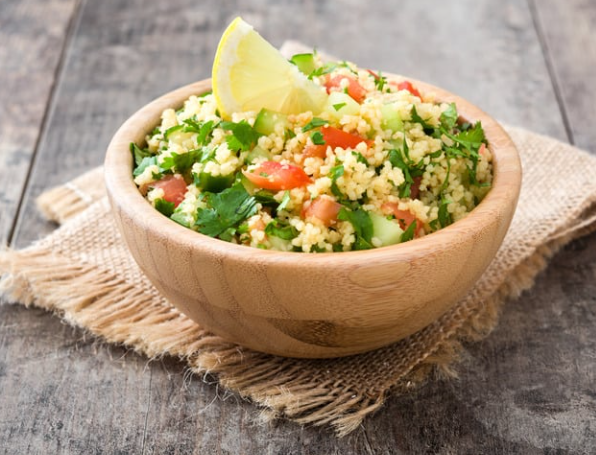 Method: Soak couscous in hot stock, then toss with chopped veg, chickpeas, olives, feta, and lemon juice.